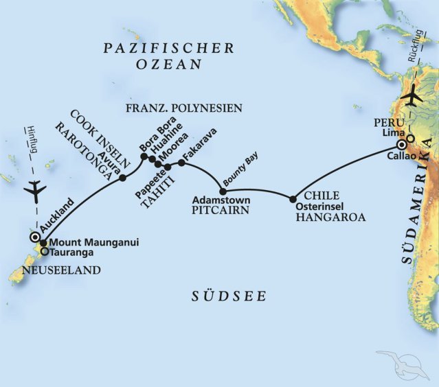 6 Länder, 11 Häfen, 13.000 Kilometer in 25 Tagen zu den schönsten Inseln und Stränden des Pazifiks. Danach 3 Tage in die Anden bis auf 3.700 Meter Höhe. Das wird eine wirklich fantastische Reise.