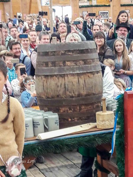 Wie es sich gehört sitzen wir kurz vor Zwölf auf unseren reservierten Plätzen, und auch Helmut und Linde sind mit ihren Bekannten aus Rohrbach rechtzeitig zu uns gestoßen. Nach der Begrüßung durch die Wirtsfamilie des Festzeltes schreitet der stellvertretende Bürgermeister der Stadt München zur Tat: 2 kurze Schläge und das Holzfaßl ist angezapft. "O'zapft iss" tönt es aus allen Kehlen und die Versorgung der durstigen Gäste kann beginnen.