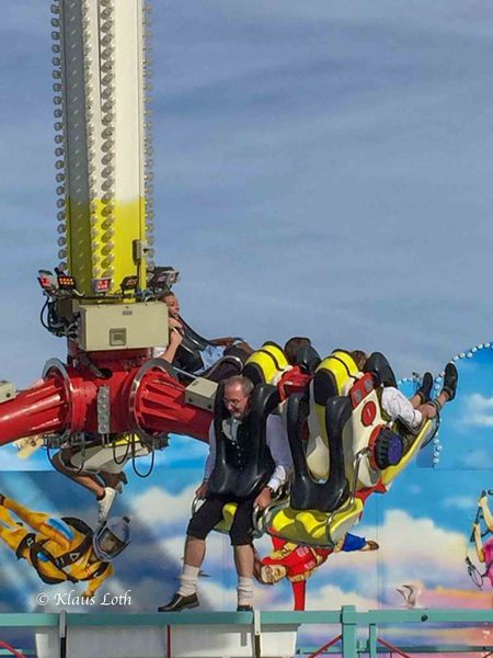 Langsam Zeit zum Aufbruch - der von mir dann noch genutzt wird auf so einer Schleudermaschine auszuprobieren ob der Verschluss im Hals fest sitzt. Klappt, auf dem Höllenritt wird kein Tropfen des edlen Saftes verloren, und ich schaue auch noch recht fröhlich aus der Wäsche als ich das Karusell verlasse.